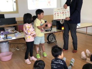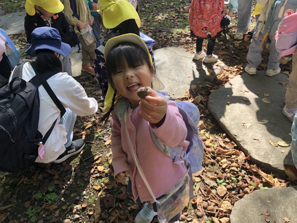 森の中を歩きながら、リスを見つけたり、木の実を拾ったりしながら楽しい時を過ごしました。間近で見るリスの姿に興奮、「こんなに木の実を集めたよ~」と自慢したりする子どもたちの姿を見ることが出来ました。