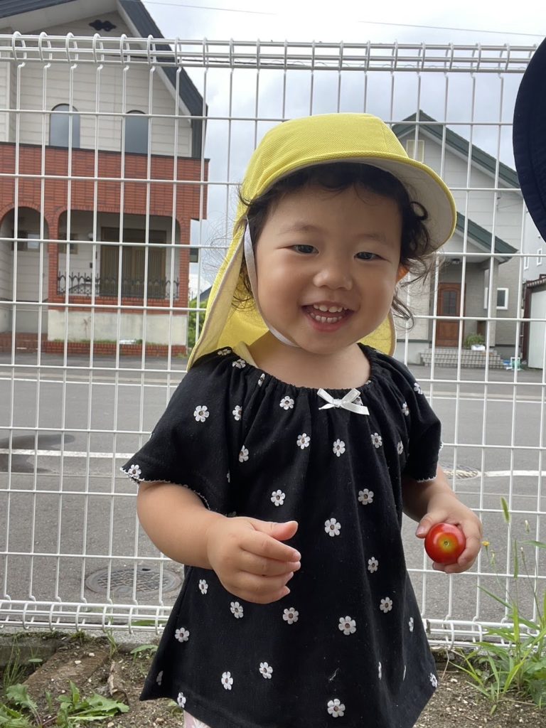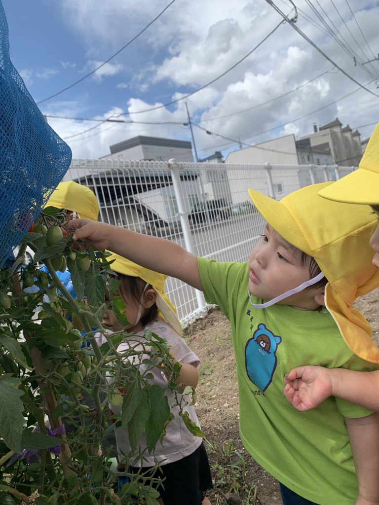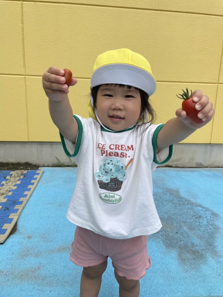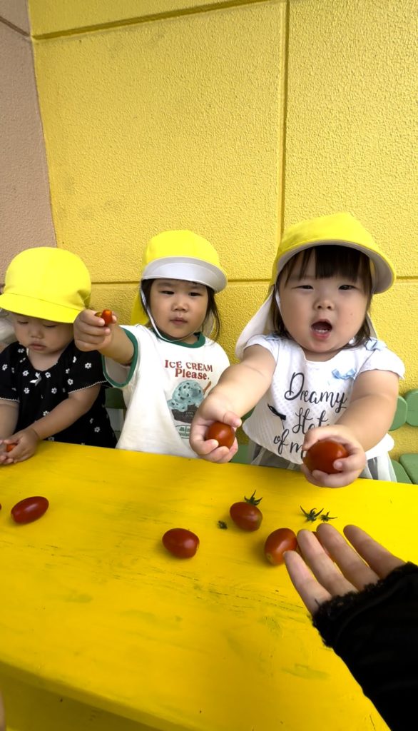 たくさんついたトマトを見て「トマト!」「トっ!」と喜んでいた子どもたち。自分の手でとったトマトをよ~く見つめている子、とれたトマトをかかげて嬉しそうにしている子、両手でとって、それぞれのトマトを見比べている子、たくさんの姿が見られます!!!