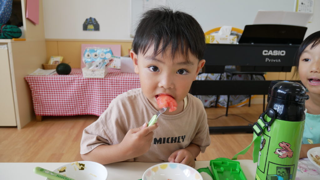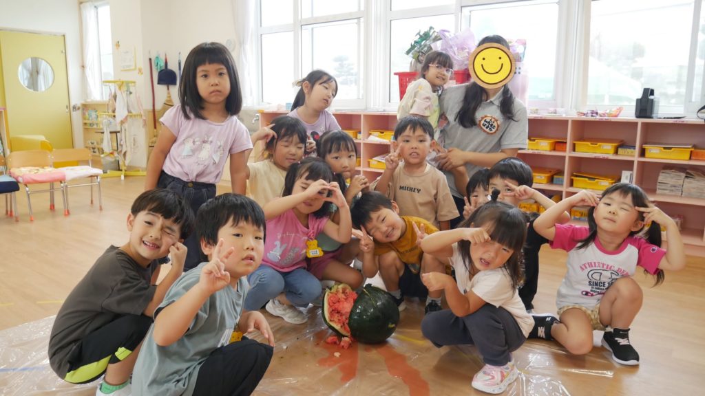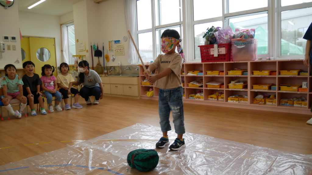 年中たんぽぽ組さんは、クラスで育てたすいかで、「すいか割り」をしました。