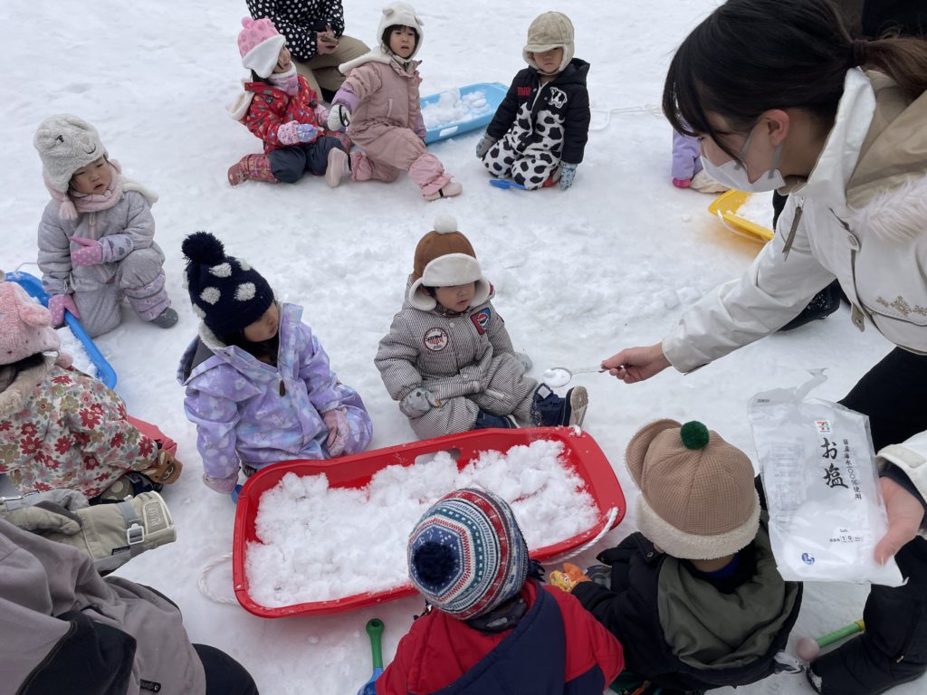 まずは、園庭でシャーベットづくり、そりに雪と塩を入れて、ジュースの入った袋を隠しました。